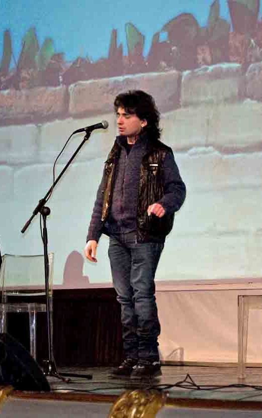 I lunghi capelli ricci gli danno già un’aria da palcoscenico, che si conferma quando si siede davanti al piano o quando afferra un microfono per cantare. I movimenti lenti spariscono, lo sguardo si alza fiero e parole e musica scorrono verso il pubblico sgorgando dal cuore.