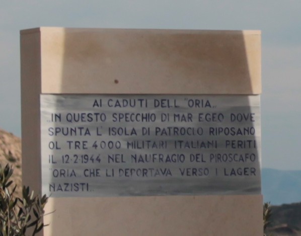 A few miles from Athens, along the road that runs along this stretch of Greec coast, you can find a particular monument. In Italiano and Greek you can read: To the fallen of Oria. In this mirror (=little part) of Aegean Sea where the Patroclus island comes out, more than 4.000 Italian soldiers rest, died on 12-2-1944 for the sinking of the steamship Oria, which was deporting them to Nazi lagers.