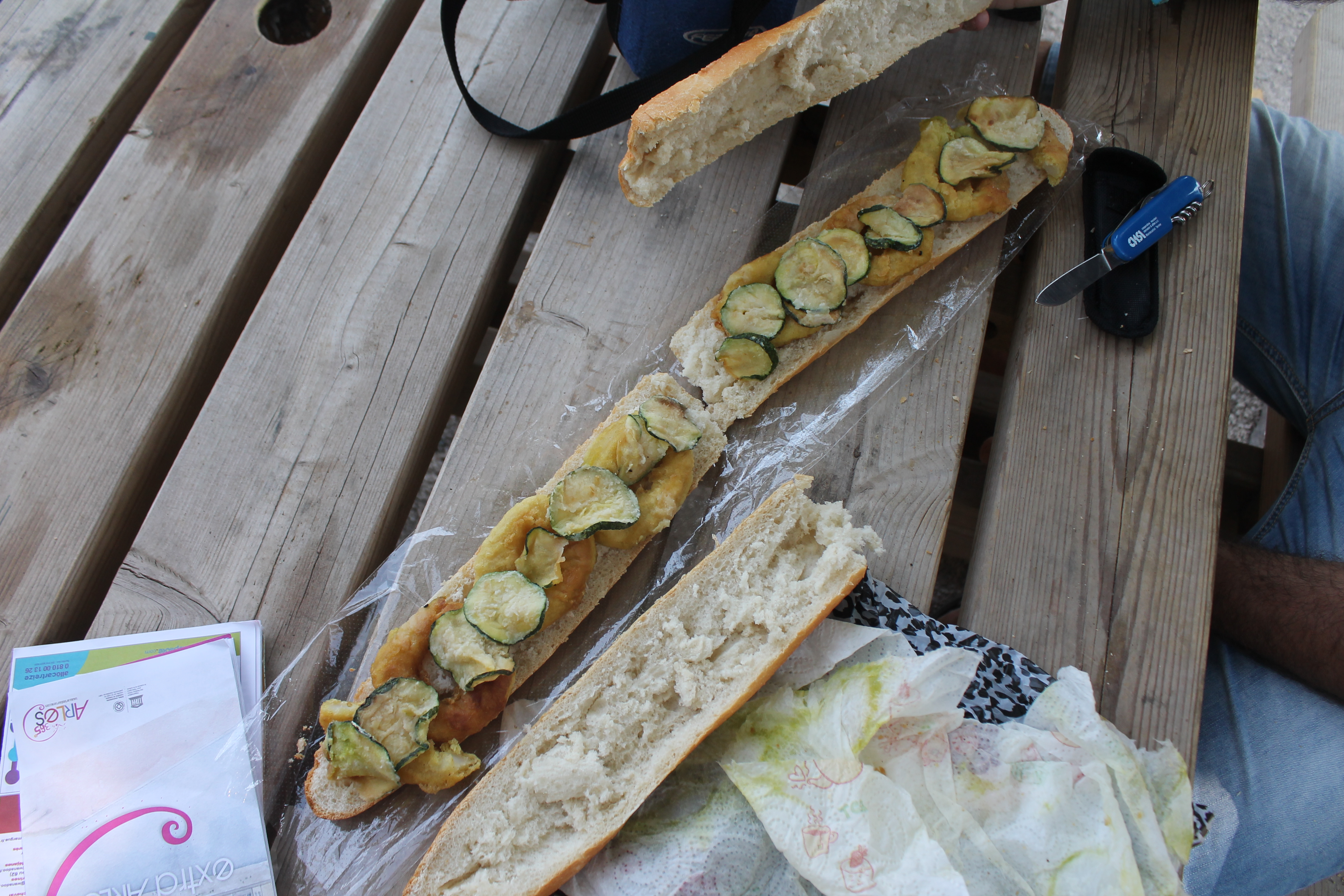 We enjoy our delicious lunch – baguette filled with the fried squid and zucchini leftover from the previous dinner – in a very strange park with ancient time games and bizarre monuments. Next to us A fianco a noi the French version of Mary Poppins pulls out from the coolbag every kind of supplies to feed the three children she has with her.