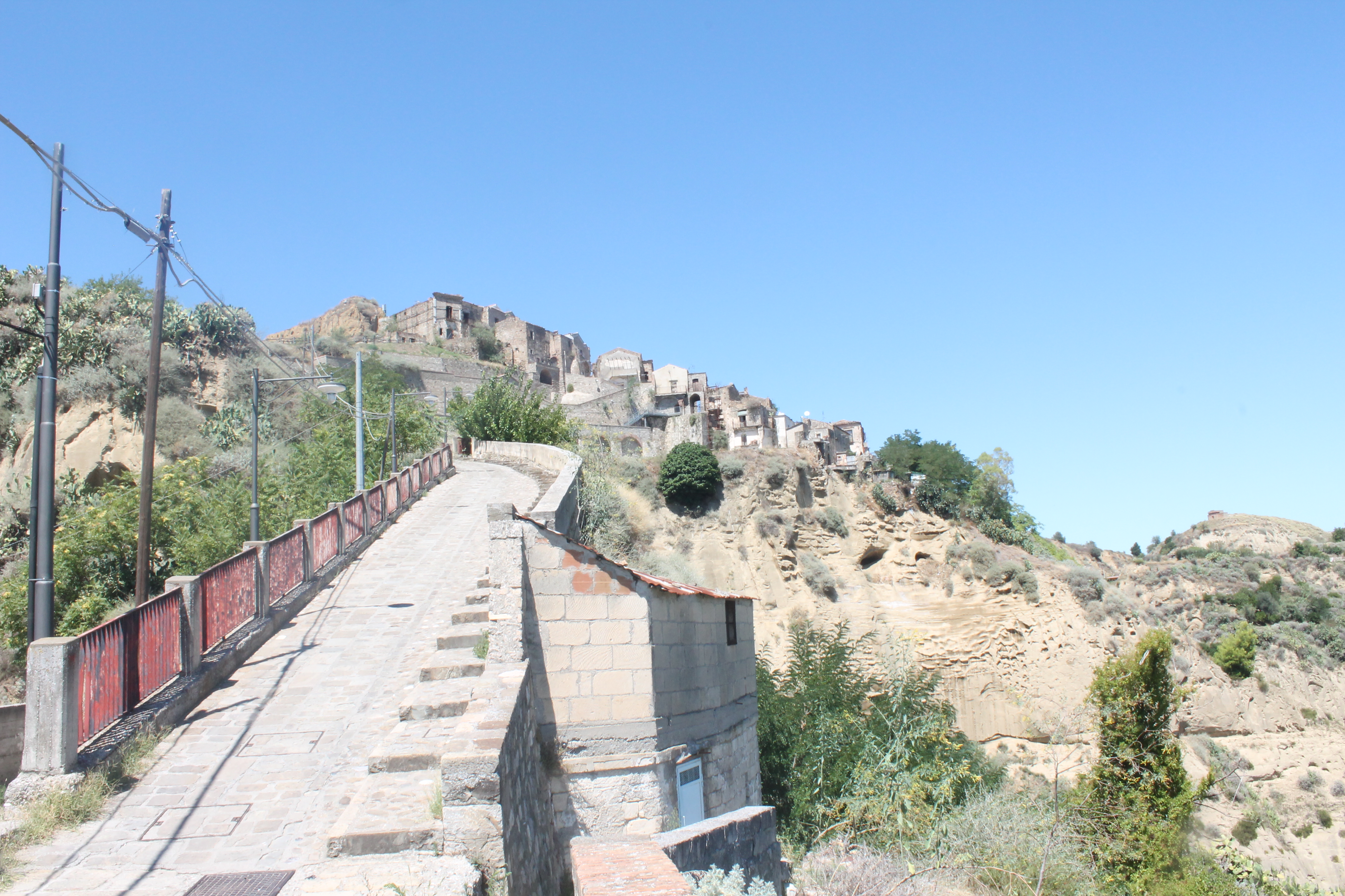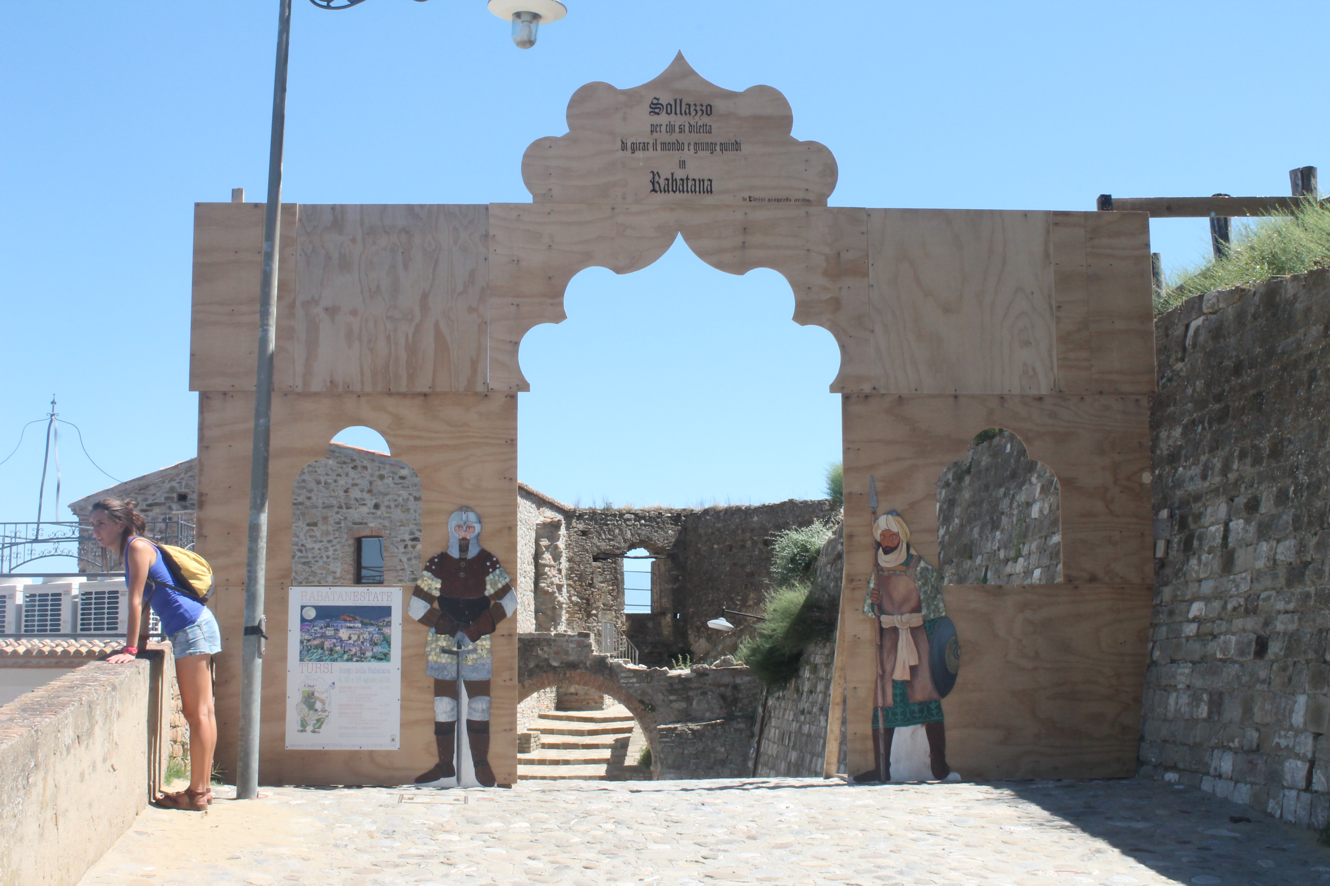 Quando il verde delle boscose montagne del Pollino – dove decine di allegre famigliole si accalcano nei prati per la tipica grigliata dell’Assunta – lascia spazio ai desertici Calanchi, con il loro aspetto grinzoso e poco ospitale, il sole alto di questo Ferragosto ci fa sentire immersi nelle scene di un film post-apocalittico. E Tursi incarna al meglio questa sensazione di disagio e tristezza. Non c’è nessuno. Non è un modo di dire, per davvero non c’è nessuno. Siamo gli unici a camminare fra questi viottoli arsi dal sole. E non capiamo cosa ci sia da vedere in questo paese. Miracolosamente incontriamo due signore, che ci suggeriscono di salire verso la Rabatana, il quartiere arabo. Speranzosi ci dirigiamo in quella direzione e troviamo un terzo abitante: un vecchio con 4 denti che ci indica la stessa meta con una risata sotto i baffi come a dire “poveri illusi”. Alla base di una grande salita che conduce al quartiere arabo, siamo ormai stremati dal caldo e dalla tristezza. Ci arrendiamo e torniamo all’auto, ma scopriamo di poterlo raggiungere girando attorno alla collina. Entriamo così da un portale in legno (probabilmente di una rievocazione storica) ma ancora una volta le nostre speranze di capire cosa ci sia da vedere qui si sciolgono in pochi secondi. Sarà stato il giorno sbagliato, ma finora Tursi è l’unica cittadina lucana a cui diamo un voto negativo.