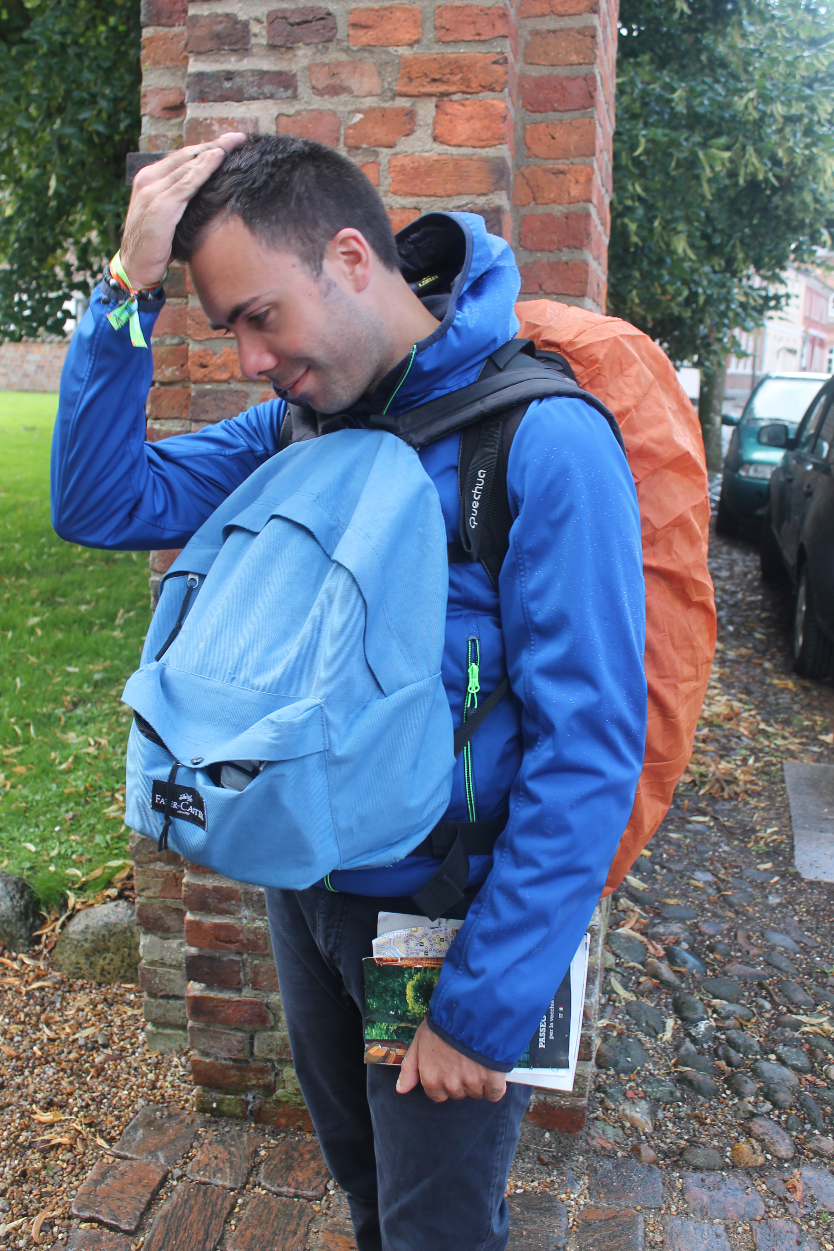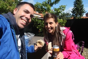 Troviamo un piccolo cortile con un tavolo, al quale ci fermiamo per mangiare i nostri panini: oggi testiamo l’ambiguo affettato “polle-rolle”, spalmato di formaggio brie, in pane di segale ai 6 semi. Per fortuna la birra danese aiuta a buttar giù ogni cosa. Mentre gustiamo il nostro succulento pasto, una signora che ci ha visti dalla finestra di fronte viene a chiederci di noi e del nostro viaggio. Confermiamo anche oggi che i Danesi sono un popolo gentile ed accogliente, sempre attenti ai viaggiatori.